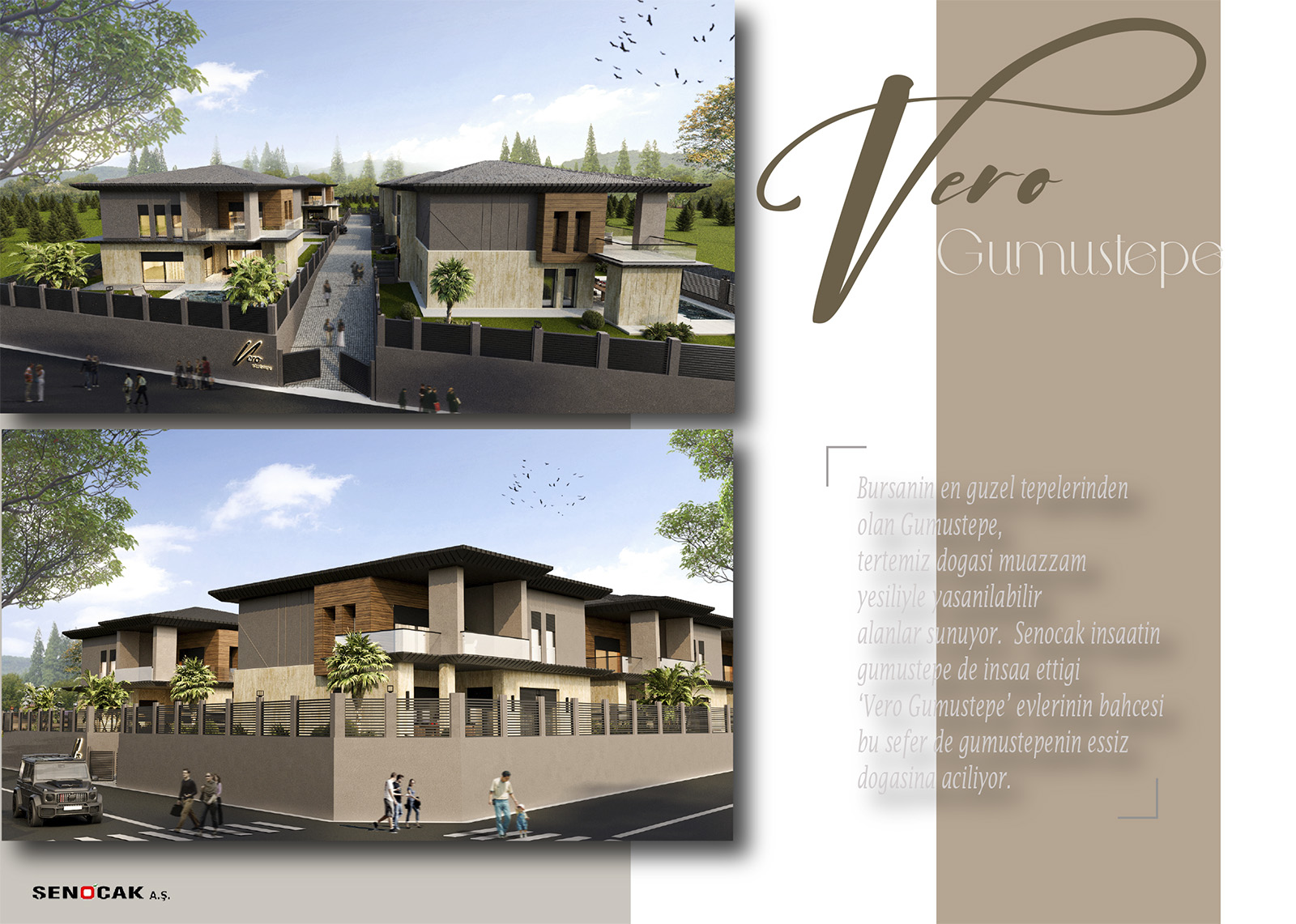 Bursanin en guzel tepelerinden olan Gumustepe, tertemiz dogasi muazzam yesiliyle yasanilabilir alanlar sunuyor. Senocak insaatin gumustepe de insaa ettigi ‘Vero Gumustepe’ evlerinin bahcesi bu sefer de gumustepenin essiz dogasina aciliyor.